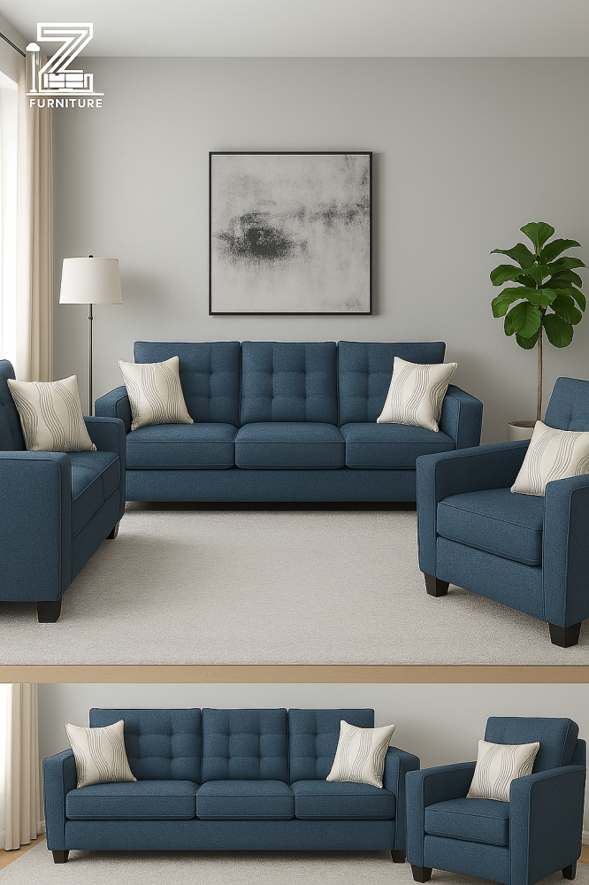 طقم كنب أنيق بتصميم عصري مكوّن من كنب ثلاثي وكنب ثنائي بالإضافة إلى 2 كرسي مفرد. يتميز القماش بجودته العالية وسهولة تنظيفه، مع خامات داخلية مريحة ومتينة تضمن دعمًا مثاليًا للجلوس الطويل. الأرجل الخشبية تضيف لمسة فاخرة للمكان، ما يجعله مثاليًا لغرف المعيشة أو الاستقبال.